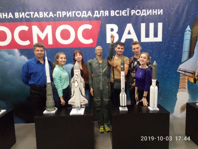 03 жовтня 2019 р. в рамках вивчення дисципліни "Астрономія" студенти-математики групи МАб-1-16-4.0д із викладачаем кафедри комп’ютерних наук і математики доцентом Бодненком Д.М. відвідали виставку "КОСМОС ВАШ" із понад 40 різними космічними зонами на площі 1400м². Потрапляючи на виставку, відвідувачі не просто ходять і дивляться на експонати, кожен гість виявляється в епіцентрі космічних подій! Наші студенти ознайомились із цікавими інтерактивними експонатами, видовищними і захоплюючими фактами космічного життя. Кожна з локацій по-своєму вражає: тренажери космонавтів; симулятор космічних кораблів; зони віртуальної та доповненої реальності; екскурсія по МКС; плазмокімната.