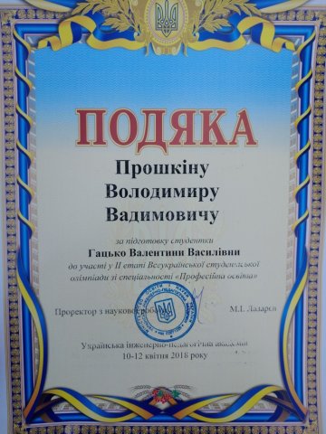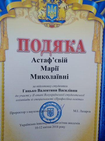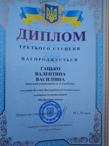 10 – 12 квітня 2018 р. в Українській інженерно-педагогічній академії (м. Харків) проходив II етап Всеукраїнської студентської олімпіади з «Професійної освіти». Наш Університет представляла Гацько Валентина, студентка 6 курсу спеціальності «Математика» Факультету інформаційних технологій та управління. Наукові керівники: Прошкін В.В., доктор педагогічних наук, професор кафедри інформаційних технологій і математичних дисциплін і Астаф’єва М.М., кандидат фізико-математичних наук, доцент кафедри інформаційних технологій і математичних дисциплін.