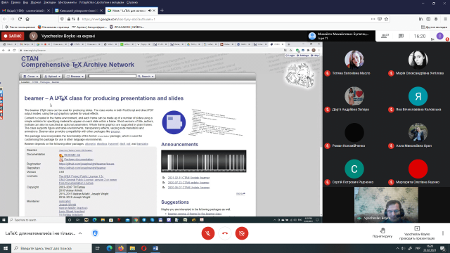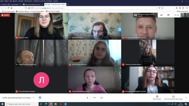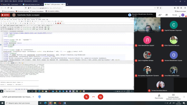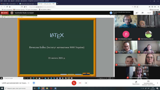 От і сьогодні, 23 лютого 2021 року з гостьовою лекцією «LaTeX: для математиків і не тільки...» до студентів і магістрантів спеціальності 111 Математика (освітні програми 111.00.01 Математика та 111.00.02 Математичне моделювання, відповідно першого та другого освітніх рівнів) завітав доктор фізико-математичних наук, старший науковий співробітник відділу математичної фізики Інституту математики НАН України Бойко Вячеслав Миколайович.