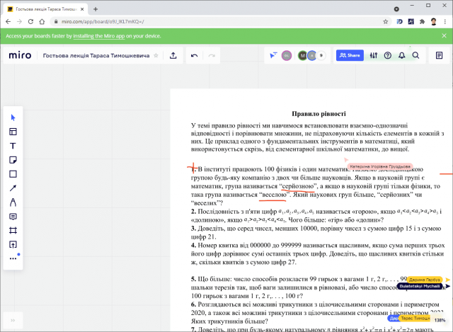 Під час заняття наші студенти відточували свої навички застосовувати один із фундаментальних інструментів, який використовується як в елементарній, так і у вищій математиці, – встановлювати взаємно-однозначні відповідності й порівнювати множини, не підраховуючи кількість елементів в кожній з них.