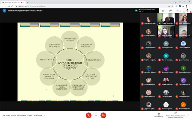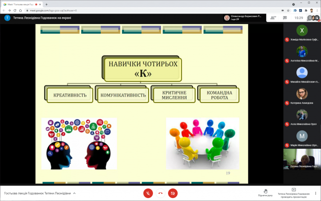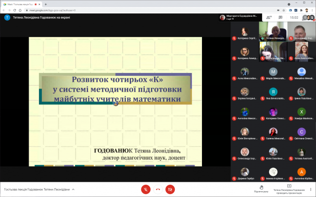 20 квітня 2021 р. для студентів-математиків і магістрантів відбулась гостьова лекція Годованюк Тетяни Леонідівни, доктора педагогічних наук, професора кафедри вищої математики та методики навчання математики, проректора з наукової роботи Уманського державного педагогічного університету імені П. Тичини. У межах лекційного заняття на тему: «Розвиток чотирьох «К» у системі методичної підготовки майбутніх учителів математики» було представлено основні тренди шкільної математичної освіти та вимоги до сучасного вчителя математики, розкрито таємницю чотирьох «К», на яких базується робота сучасного вчителя, – креативність, комунікативність, критичне мислення та командна робота.