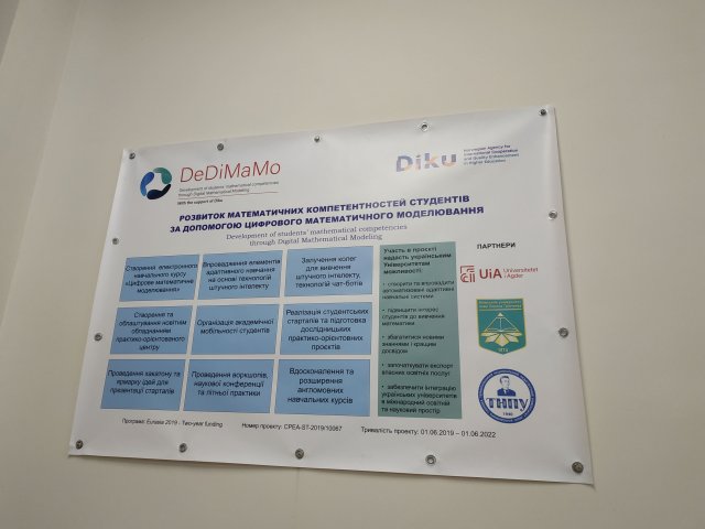 27 вересня 2021 року в на Факультеті інформаційних технологій та управління відбулась презентація Центру моделювання та програмування, який було оновлено в рамках реалізації міжнародного наукового проєкту «Розвиток математичних компетентностей студентів за допомогою цифрового математичного моделювання» (DeDiMaMo) програми EURASIA 2019, CPEA-ST-2019/10067. Центр обладнано за підтримки Норвезького агентства міжнародного співробітництва. Обладнання центру: персональні комп'ютери мультимедійні – моноблоки (6 шт.), ноутбуки (2 шт.), принтер 3D (1 шт.), загальною вартістю 325 200 грн.
