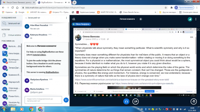 12 листопада викладачі кафедри комп’ютерних наук і математики разом із студентами і магістрантами спеціальності 111 Математика долучились до семінару, присвяченому симетрії Лі диференціальних рівнянь. Семінар проводила Ванєєва Олена Олександрівна – докторка фізико-математичних наук, провідна наукова співробітниця відділу математичної фізики Інституту математики НАН України, переможниця премії L'ORÉAL-ЮНЕСКО «Для жінок у науці», наставниця у проєктах STEM Girls та Global Talent Mentoring, популяризаторка математики, виконавча редакторка Українського математичного журналу.