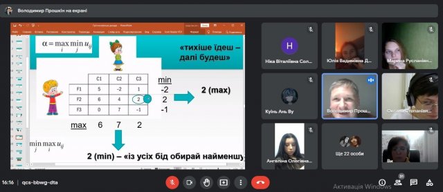 9 грудня 2021 року в рамках Грінченківської декади студенти та викладачі Факультету інформаційних технологій та управління стали учасниками майстер-класу «Теорія ігор: від науки до життя». Захід провів Прошкін В.В., доктор педагогічних наук, професор, професор кафедри комп’ютерних наук і математики.