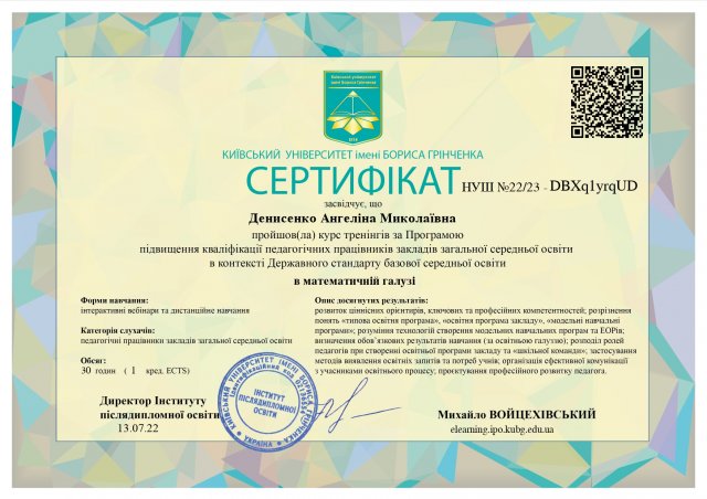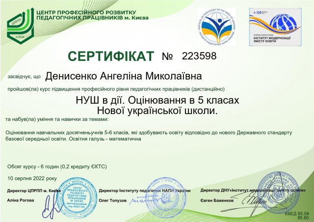 Протягом липня та серпня 2022 р. Ангеліна пройшла навчальні модулі «Удосконалення комунікативної компетентності педагога закладу освіти», «Реалізація прикладної спрямованості шкільного курсу математики шляхом розв’язання текстових задач» (на базі Інституту педагогічної освіти КУБГ), а також курс підвищення професійного рівня педагогічних працівників «НУШ в дії. Оцінювання в 5 класах Нової Української Школи» (на базі Інституту модернізації змісту освіти).