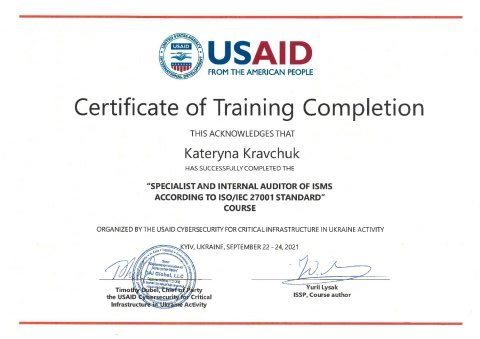 Протягом вересня, жовтня 2021 р. Катерина Кравчук, магістрантка спеціальності 111 «Математика» успішно пройшла курси з питань інформаційної безпеки: «SPECIALIST AND INTERNAL AUDITOR OF ISMS ACCORDING TO ISO/IEC 27001 STANDARD», «I-CSE – CYBERSECURITY ESSENTIALS». Навчання проводилось в офлайн режимі в ISSP Training Center у межах проєкту USAID «Кібербезпека критично важливої інфраструктури України». Курси охоплювали основні знання і навички у всіх областях безпеки в кіберпросторі з використанням математичного апарату – інформаційна безпека, системна безпека, мережева безпека, мобільна безпека, фізична безпека, етика і закони, пов'язані технології, використання технологій захисту і пом'якшення у захисті бізнесу, а також, було опановано навички впровадження, забезпечення підтримки СУІБ (Системи управління інформаційною безпекою) та аналізу її стану.