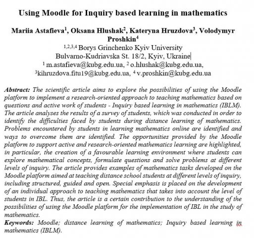 Нещодавно викладачі Марія Астаф’єва, Оксана Глушак і Володимир Прошкін завершили дослідження з використання системи Moodle для реалізації Inquiry-based learning в математиці. Активним учасником дослідницької команди є Катерина Груздьова, магістрантка 1 року навчання спеціальності «Математика». Катерина здійснила апробацію авторських науково-методичних розробок під час викладання математики в спеціалізованій школі № 129 м. Києва.