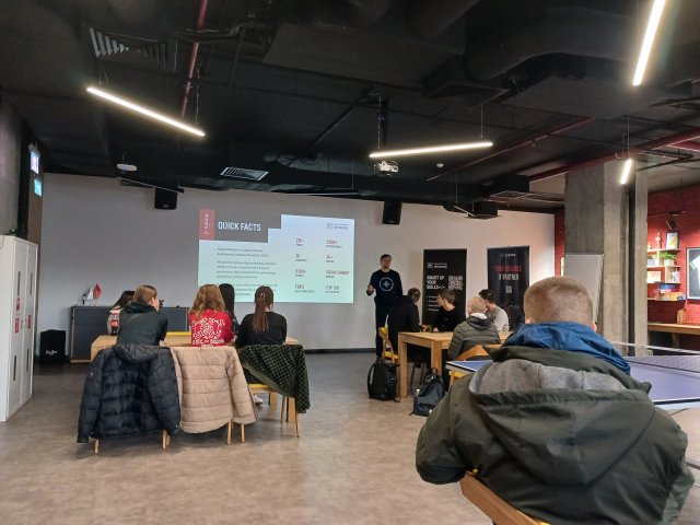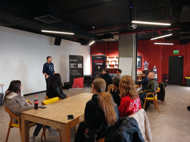 Влад Янцов, тренінг-менеджер компанії Sigma Software, обговорив зі студентами найактуальніші питання: як можна приєднатися до компанії у майбутньому, які є найзатребуваніші напрямки для фахівця-початківця в ІТ, який рівень володіння англійською мовою є мінімально-необхідний, які знання потрібно здобувати навчаючись в університеті й приділяти цьому в студентські роки велику увагу. Говорили про стажування як чудову можливість стартувати в ІТ для тих, хто ще не має практичних знань, але вже володіє теоретичними основами.