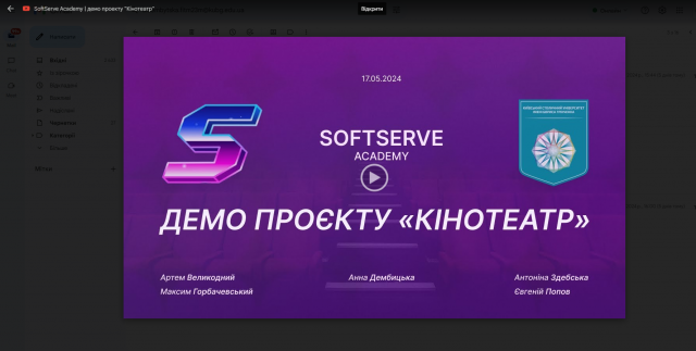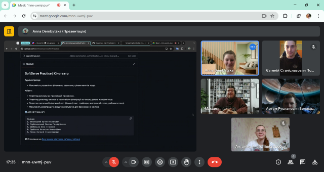 Протягом трьох тижнів (з 29.04-19.05 2024 р.) здобувачі І курсу освітньої програми "Інформаційно-аналітичні системи" спеціальності 122 «Комп’ютерні науки» Дембіцька Анна, Здебська Антоніна, Горбачевський Максим, Великодній Артем та Попов Євгеній в рамках співпраці факультету із відомою компанією SoftServe проходили на базі компанії виробничу практику. Під керівництвом ментора практиканти мали можливість закріпити й поглибити теоретичні знання, уміння та навички, набуті в під час навчання в університеті, під час розробки та захисту власного проєкту.