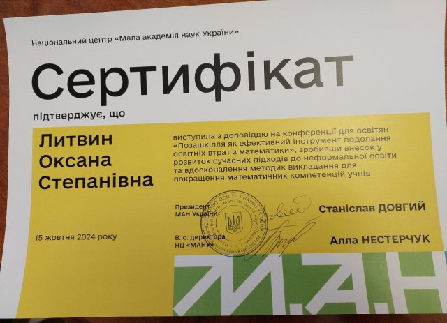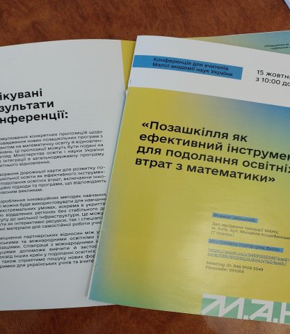 15 жовтня 2024 року на базі лабораторії математичних наук НЦ «Мала академія наук України» відбувся захід, присвячений розв’язанню проблем освітніх втрат з математики в Україні – конференція на тему «Позашкілля як ефективний інструмент для подолання освітніх втрат з математики».