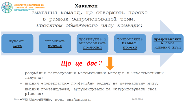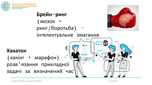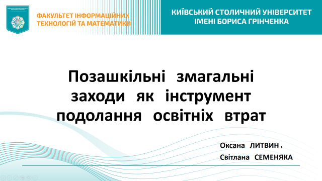Університет Грінченка на даному заході представляли Оксана Литвин, декан Факультету інформаційних технологій та математики, та Світлана Семеняка, завідувачка кафедри математики і фізики. У своїй доповіді «Проведення позашкільних змагальних заходів як інструмент подолання освітніх втрат» Оксана Литвин поділилася досвідом організації та проведення командних змагань «Брейн-ринг» (для школярів, у рамках святкування Дня числа Пі) та «Хакатон» (для студентів спеціальностей «Комп’ютерні науки» та «Математика»).