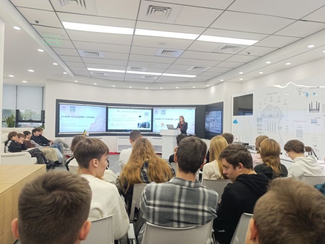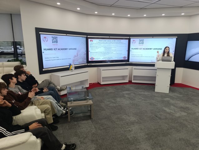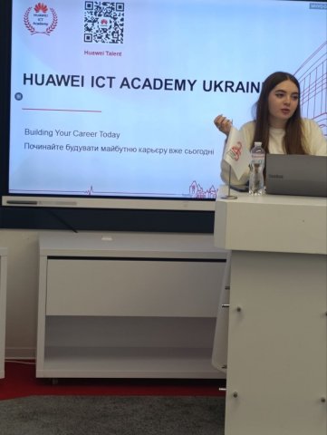 Зустріч розпочалася зі щирого вітання від представників Huawei. Далі наші студенти мали змогу поглибити свої знання про компанію, дізнатися про роботу Huawei ICT Academy, а також про спеціальні програми та конкурси для студентів, які допомагають розвивати практичні навички та будувати кар'єру в галузі. Про це розповіла PR-фахівець Анастасія Бурда.