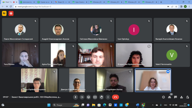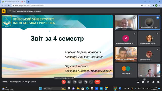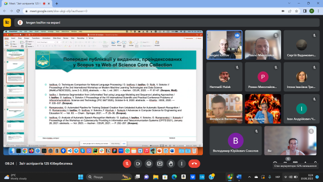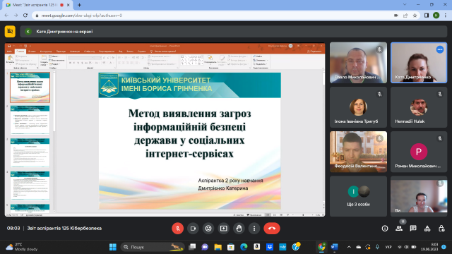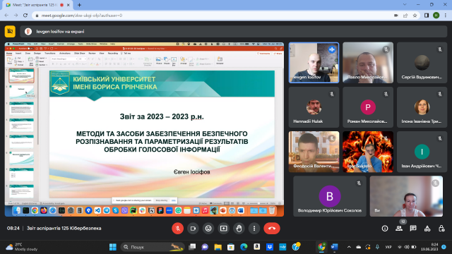 19 червня 2023 року відбулося чергове засідання кафедри інформаційної та кібернетичної безпеки імені професора Володимира Бурячка, на якому здобувачі третього (освітньо-наукового) рівня ОНП «Інформаційна безпека держави» спеціальності 125 Кібербезпека представили звіти про виконання індивідуальних планів за 2022-2023 навчальний рік.