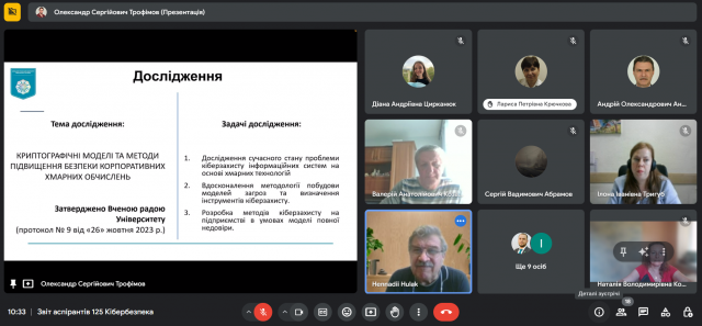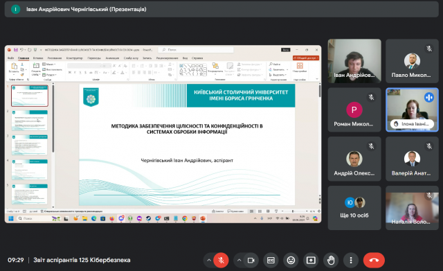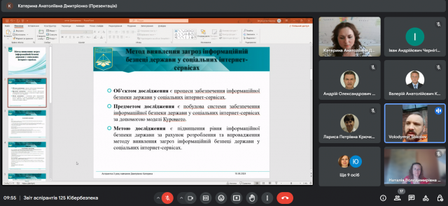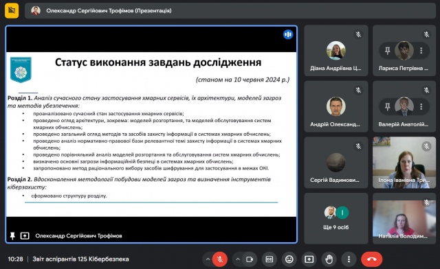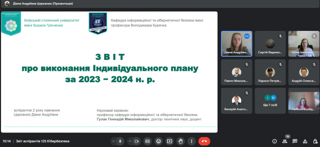 18 червня 2024 року на засіданні кафедри інформаційної та кібернетичної безпеки імені професора Володимира Бурячка здобувачі третього (освітньо-наукового рівня) вищої освіти ОНП «Інформаційна безпека держави» представили звіти про виконання індивідуальних планів виконання освітньо-наукової програми підготовки доктора філософії за 2023-2024 навчальний рік. Професори та доценти кафедри надали зауваження й рекомендації молодим науковцям та пересвідчилися у їхній високій мотивації до наукових досліджень. За результатами голосування кафедра клопочеться про переведення здобувачів 1-3 років на наступний рік навчання.