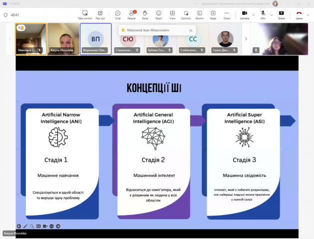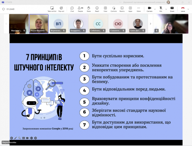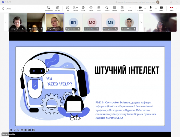 As part of the IV Summer School for Professional Development “AI + Education + Science 2.0” project organized by the All-Ukrainian Public Organization “Innovative University”, a guest lecture was given by Karina Khorolska, PhD in Computer Science, Associate Professor at the Department of Information and Cyber Security named after Professor Volodymyr Buryachok, for students of specialty “Software Engineering” at the State University of Trade and Economics.