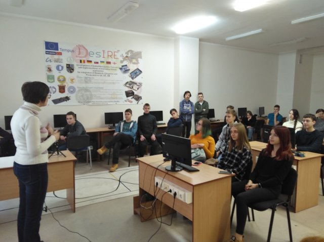 Екскурсія розпочалася за класикою – з роздягальні і плавно коридорами університету перемістилася на п’ятий поверх – територію Факультету інформаційних технологій та управління. В Грінченківській аудиторії учні отримали інформацію про факультети та інститути нашого університету, а також детально ознайомилися зі спеціальностями, що розвиваються на нашому Факультеті й кафедрі комп’ютерних наук і математики, зокрема. Велика увага приділялася особливостям освітніх програм таких спеціальностей як математика та комп’ютерні науки, практико орієнтовному навчанню, роботі в Центрах розвитку компетентностей.