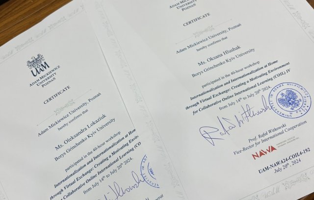 З 14 по 20 липня 2024 року Глушак Оксана, кандидат педагогічних наук, доцент кафедри комп'ютерних наук, та Локазюк Олександра, кандидат фізико-математичних наук, старший викладач кафедри математики і фізики, взяли участь у літній школі «Internationalization and Internationalization at Home through Virtual Exchange: Creating a Motivating Environment for Collaborative Online International Learning» на базі Університету імені Адама Міцкевича (Adam Mickiewicz University, м. Познань, Польща).