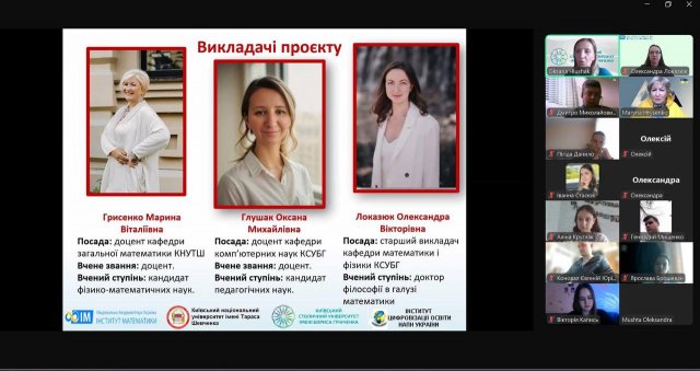 До участі в проєкті долучилися студенти Університету Грінченка, які навчаються за спеціальностями «Комп’ютерні науки» та «Математика», а також студенти механіко-математичного факультету Київського національного університету імені Тараса Шевченка, які опановують освітню програму «Математика (середня освіта)». Свою наукову експертизу до співпраці внесли й аспіранти Інституту математики НАН України та Інституту цифровізації освіти НАПН України, чиї дослідження охоплюють математичне моделювання, штучний інтелект і цифровізацію наукової діяльності. Організаторами проєкту стали досвідчені науковці та викладачі: Марина Грисенко, доцент кафедри загальної математики Київського національного університету імені Тараса Шевченка, Оксана Глушак, доцент кафедри комп’ютерних наук Університету Грінченка, та Олександра Локазюк, старший викладач кафедри математики і фізики Університету Грінченка, а також молодший науковий співробітник відділу математичної фізики Інституту математики НАН України.
