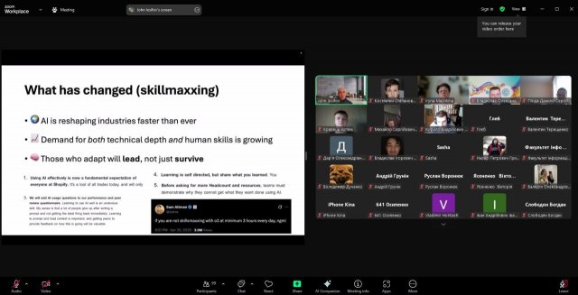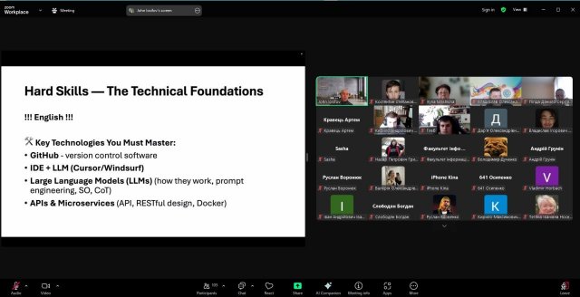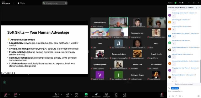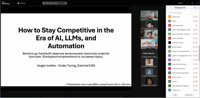 Євген виступив з актуальною для сьогодення темою «Вимоги до hard/soft навичок випускників технічних освітніх програм. Конкурентоспроможність на ринку праці». Як залишатись компетентним та затребуваним ІТ-фахівцем в еру штучного інтелекту та автоматизації, які навички та знання в ІТ-галузі залишаються актуальними сьогодні, якими hard та soft компетенціями має володіти сучасний випускник інженерних спеціальностей, щоб бути та  залишатися конкурентоспроможним – ці та інші питання розібрали учасники зустрічі.